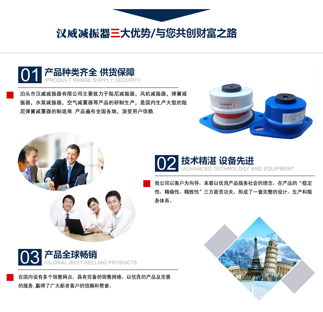 ?泊頭市漢威減振器有限公司主要致力于阻尼減振器,風機減振器,彈簧減振器,水泵減振器,空氣減震器等產(chǎn)品的研制生產(chǎn),是國內(nèi)生產(chǎn)阻尼彈簧減震器的制造商,產(chǎn)品廣泛用于中央空調(diào)、通風管道、鋼鐵、發(fā)電、石化、水泥和城市供熱等行業(yè)的各類管道和設(shè)備上,并在全國多地工程上得到應(yīng)用,業(yè)績遍布全國多地,深受用戶信賴. 公司主要減振器系列產(chǎn)品有:中央空調(diào)系列減振器、泵房系列減振器、管道系列減振器、風機系列減振器、以及自行設(shè)計制作的系列隔振臺座。泊頭市漢威減震器科技有限公司擁有多名高素質(zhì)技術(shù)人員,擁有完善的阻尼彈簧減震器生產(chǎn)和檢驗專用設(shè)備,擁有硅橡膠自動擠出生產(chǎn)線,全自動彈簧機等設(shè)備。生產(chǎn)條件逐漸完善進步,努力擴大生產(chǎn)規(guī)模,提高泊頭市減震器科技有限公司的生產(chǎn)競爭力。 多年來漢威減振器以三誠作為公司的字號,旨在立足當前......